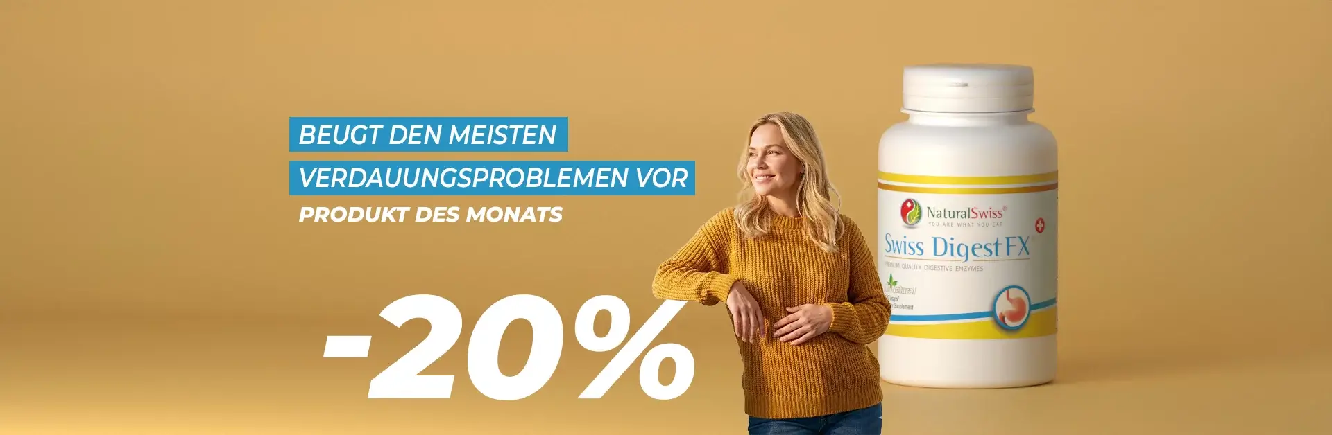NaturalSwiss DigestFX® ist ein sorgfältig ausgewähltes Nahrungsergänzungsmittel mit natürlichen Enzymen. Es enthält 7 Arten von Enzymen und 4 Arten pflanzliche Wirkstoffe für eine sofortige Wirkung bei Verdauungs- und Blähungsproblemen: Papain und Bromelain spalten Proteine, Lipase spaltet Fette, Cellulase spaltet pflanzliche Fasern und Lactase spaltet Laktose. Es erleichtert die Verdauung bei Laktoseintoleranz. Seine Wirkstoffe fördern die Verdauung und den Abbau der Nährstoffe. Die pflanzlichen Inhaltsstoffe unterstützen den Stoffwechsel und lindern eventuelle Verdauungsbeschwerden.