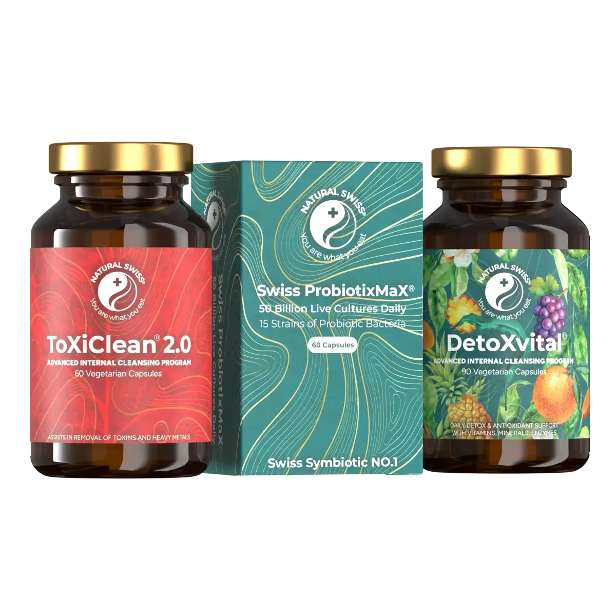 Das ToxiClean Programm enthält drei sorgfältig ausgewählte Produkte mit natürlichen Wirkstoffen, nämlich ToxiClean Kapseln, Detox Vital Kapseln und Swiss Probiotix Max Kapseln. Das komplette NaturalSwiss Darmreinigungs- und Entgiftungsprogramm besteht aus der Produktkombination von Clean Inside Programm und ToxiClean Programm.