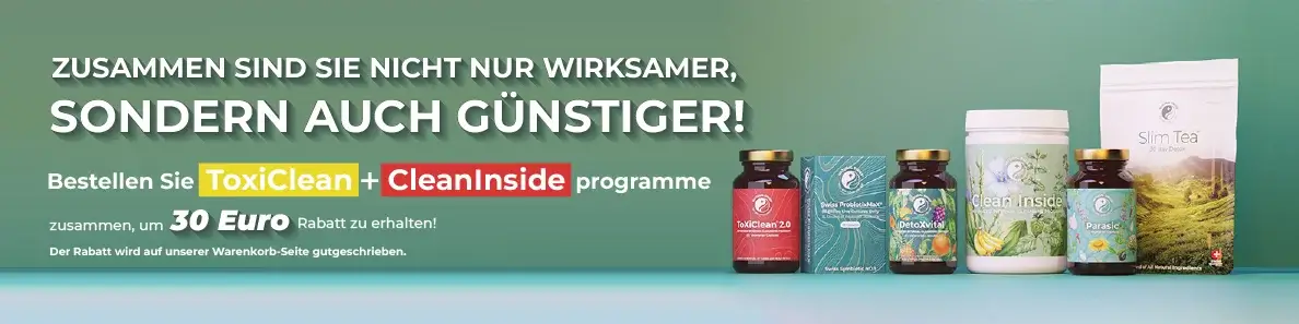 Für unsere Forscher war es bei der Entwicklung der ToxiClean® Breitspektrum-Entgiftungskur ein wichtiger Gesichtspunkt, dass es in Kombination mit dem Clean Inside® Programm angewendet in der Lage sein sollte, eine vollständige Entgiftung zu erreichen, sowie auch dazu, einer erneuten Ablagerung vorzubeugen. Neben all diesem soll sie auch unseren ganzen Organismus mit wichtigen Nährstoffen versorgen. Die ToxiClean® Entgiftungskur kann also ergänzend neben der Clean Inside®-Programm verwendet werden. Ihre kombinierte Anwendung stellt die gründlichste, den ganzen Organismus umfassende Entgiftungskur dar, die jemals entwickelt wurde.
